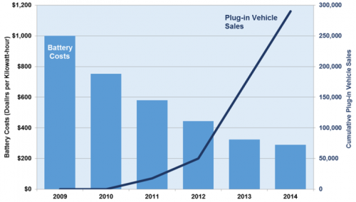 Depuis 2009, le prix des batteries des voitures électriques aurait été divisé par 5. Les ventes de véhicules électriques progressent en rythme avec la baisse du prix des batteries.